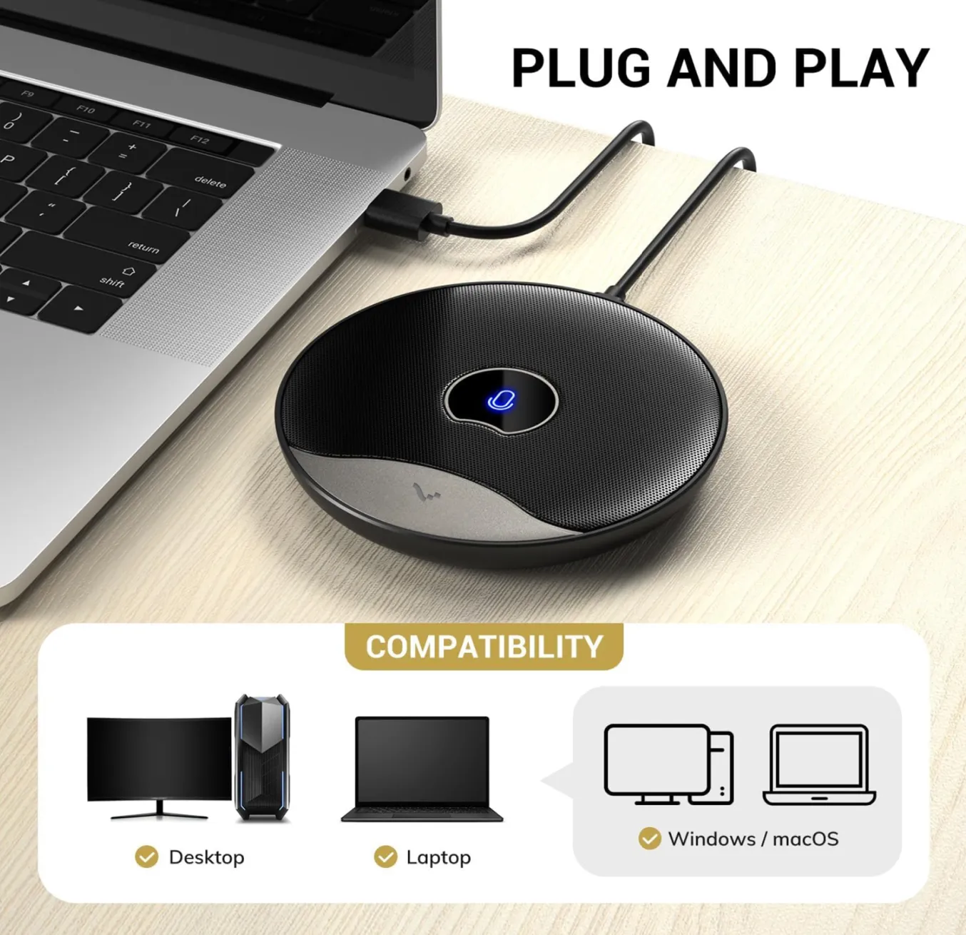 Es plug & play, compatible con Windows y macOS. Solo conéctalo a tu ordenador y comienza a usarlo sin instalar drivers adicionales. Además, cuenta con un botón de silencio con indicador luminoso (azul: funcionando, rojo: en silencio), para que controles la reunión y silencies el micrófono rápidamente si lo necesitas.